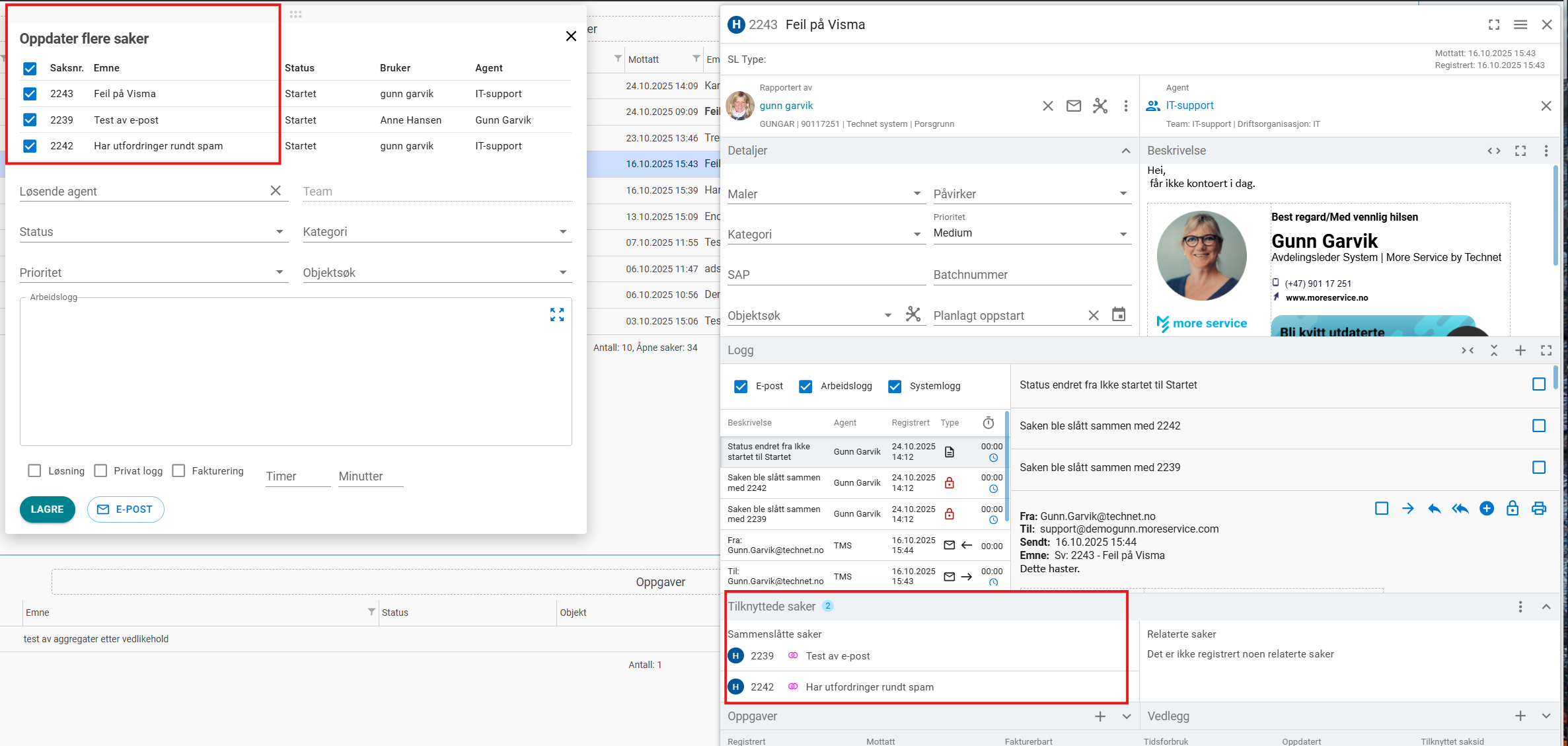 Viser «dialogboks for "Oppdater flere saker"» når en sammenslått sak åpnes