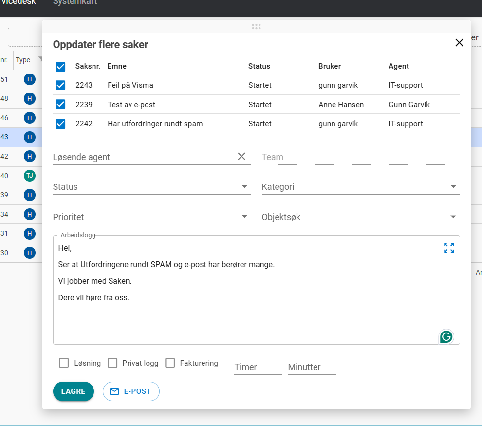 Hoved sak og dialogboks "Oppdater flere saker" kommer opp samtidig