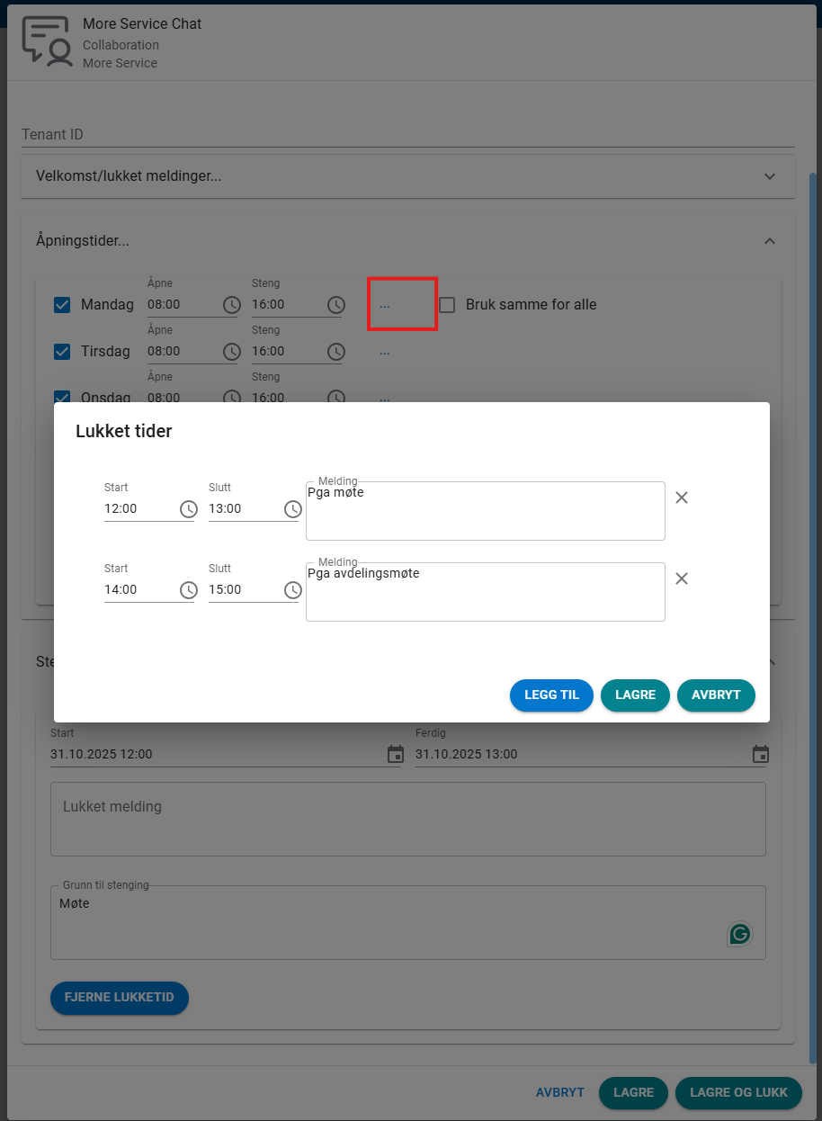 Ved å trykke på 3 prikker som er rammet rundt med rødt kan dere legge til flere stengetider for chaten