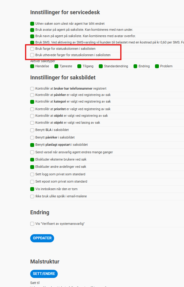 Oversiktsbildet: La til støtte for bruk av farge på statuskolonnen i saksnettet på servicedesken
