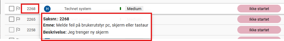 Når man holder musepekeren over saksnummeret i tabellen i servicedeskoversikt