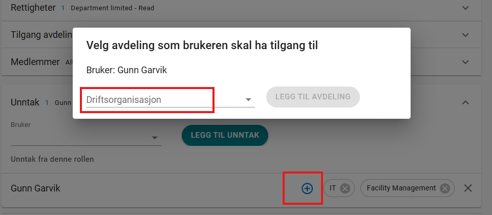 Velg så + tegnet og legg til andre avdelinger(driftorganisasjoner)
